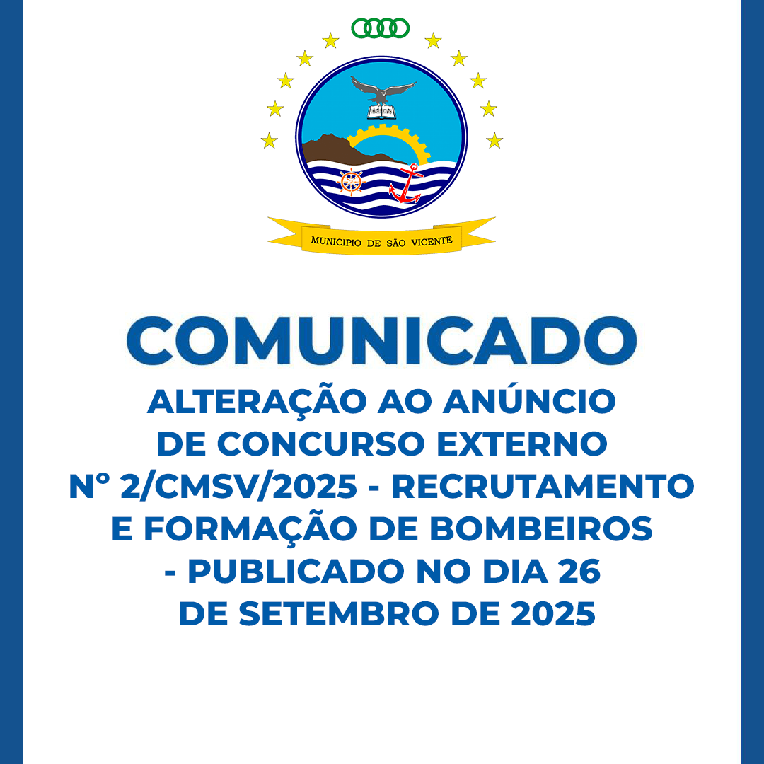 A Câmara Municipal de São Vicente informa que houve alteração ao Anúncio do Concurso Externo nº 2/CMSV/2025 – Recrutamento e Formação de Bombeiros, publicado no dia 26 de setembro de 2025. Pelo presente, torna-se público que foram alterados a alínea …